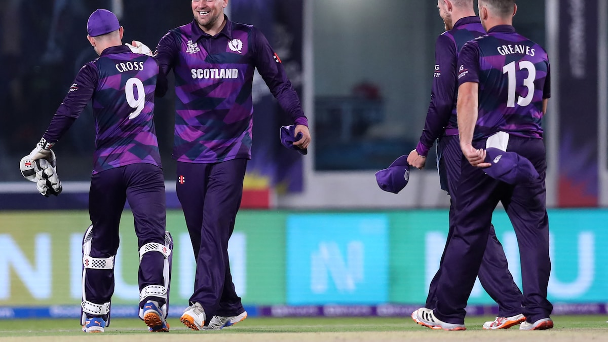 Scotland players celebrate their win over Bangladesh in the T20 World Cup on Sunday.© AFP